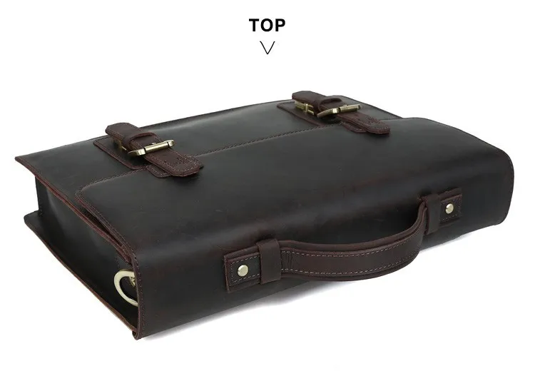 Oberschicht aus echtem Crazy-Horse-Rindsleder; Oberer Griff aus Vollleder und bronzefarbenen Beschlägen; Verstellbarer, gepolsterter und abnehmbarer Schultergurt aus Leder und Geflecht, längenverstellbar bis 55 Zoll