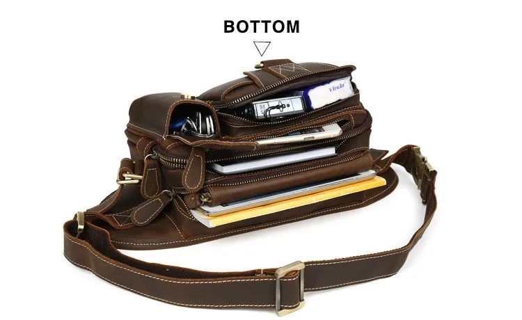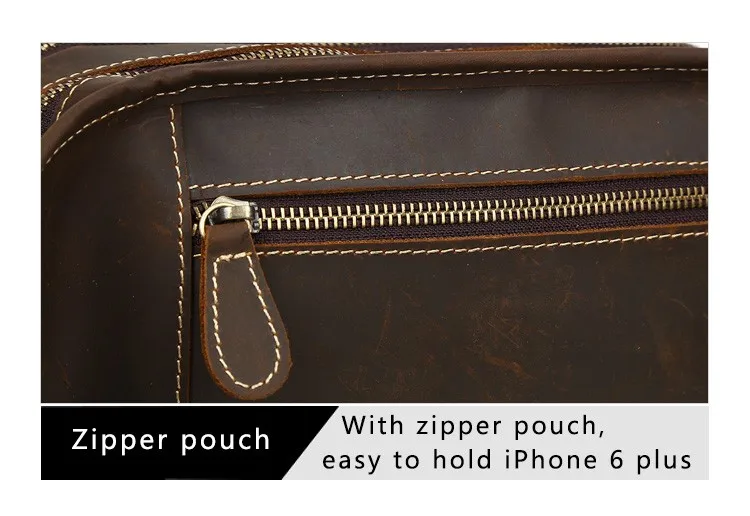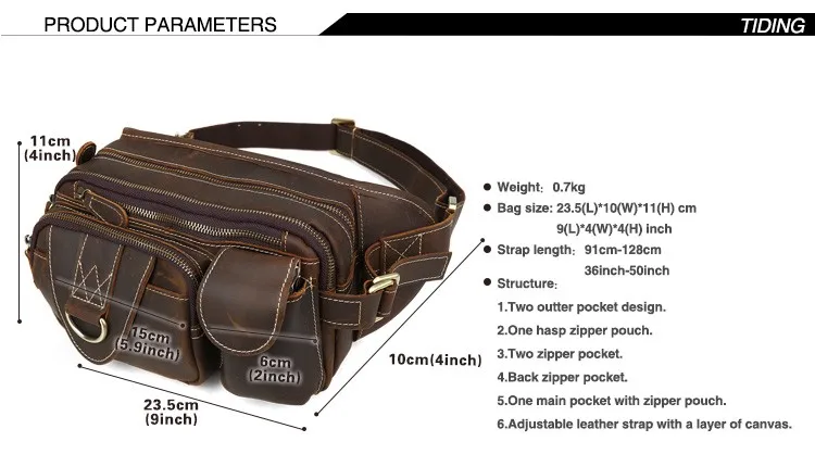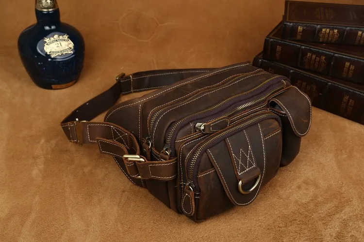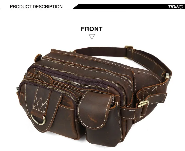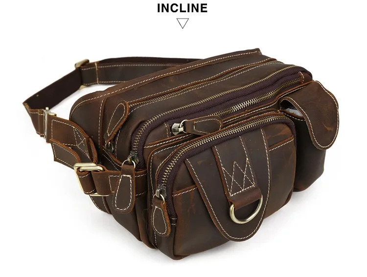 Diese Gürteltasche aus Leder verfügt über 5 Reißverschlusstaschen. In dieser Gürteltasche aus Leder, die zum freihändigen Tragen konzipiert ist, bleiben Ihre Habseligkeiten organisiert und sicher.
