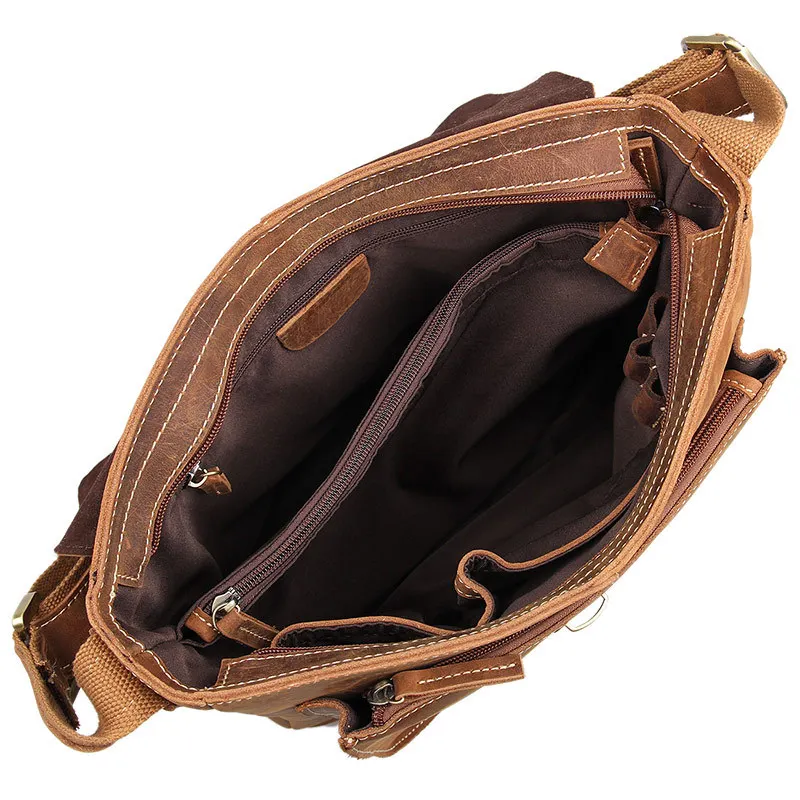 Diese Messenger-Umhängetasche aus Leder verfügt über einen hochwertigen YKK-Metallreißverschluss, der einen 1000-fachen Zugfestigkeitstest aushält, ohne dass Sie sich Sorgen machen müssen, dass der Reißverschluss kaputt geht. Die schlanken, robusten Metallbeschläge in Messingtönen sind dreimal dicker als normale Beschläge, antioxidativ und korrosionsbeständig und langlebig.