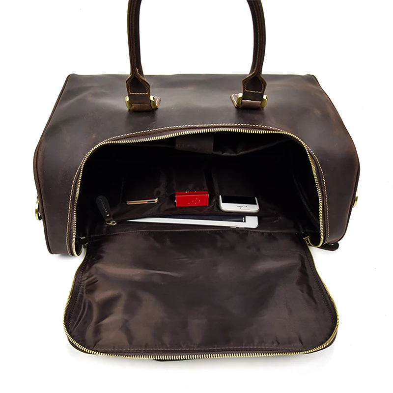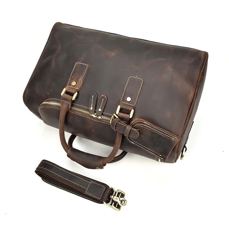 Ce sac de voyage vintage en cuir Crazy Horse est fait de cuir pleine fleur avec une doublure en flanelle de coton doux avec des bretelles et une poignée pour une utilisation comme sac de week-end, sac de sport, sac de voyage ou sac de sport.