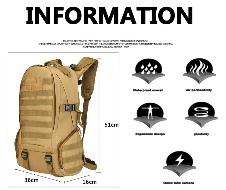 Très grand espace de stockage de 35 L et de nombreuses poches intégrées avec tige de suspension militaire Molle telles que des sous-emballages et des poches pour outils d'extérieur pour un rangement stratégique en surface, sur les deux côtés et en bas.