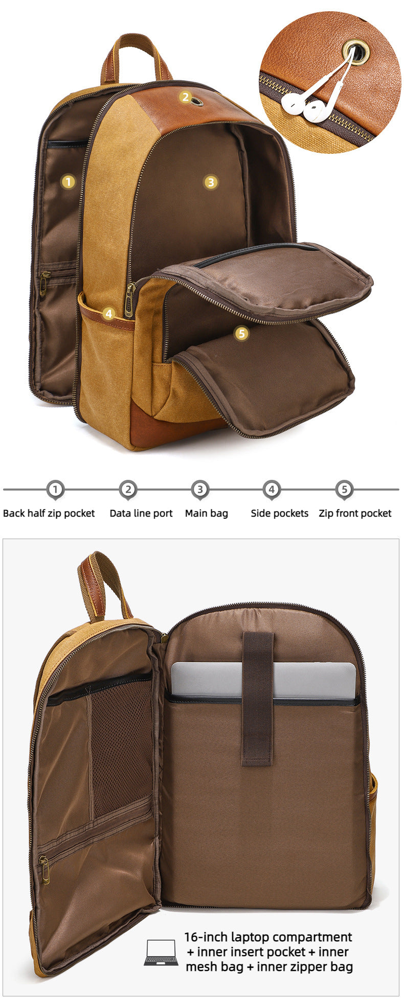 Structure du sac : sac principal (compartiment indépendant pour ordinateur de 16 pouces) + sac avant + sac latéral + sac intérieur à fermeture éclair + poche intérieure + sac intérieur en filet.